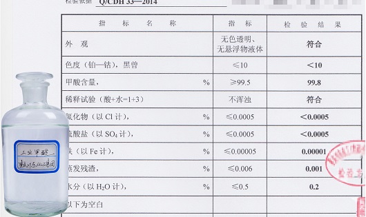 產品特點:多項專利技術應用于生產中,產量高、雜質少、質量穩定、高濃度甲酸含量可達99.5%以上。